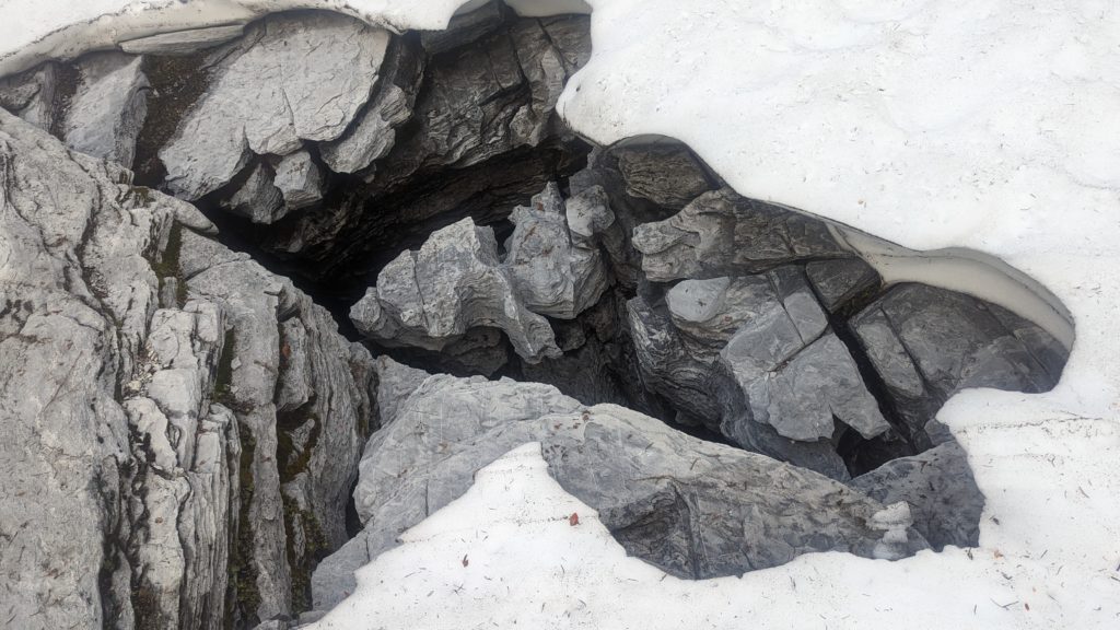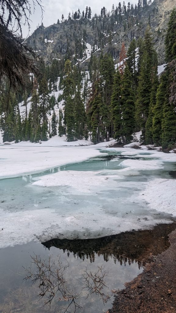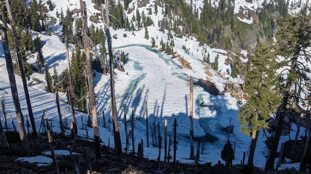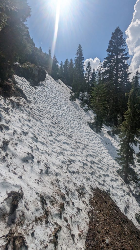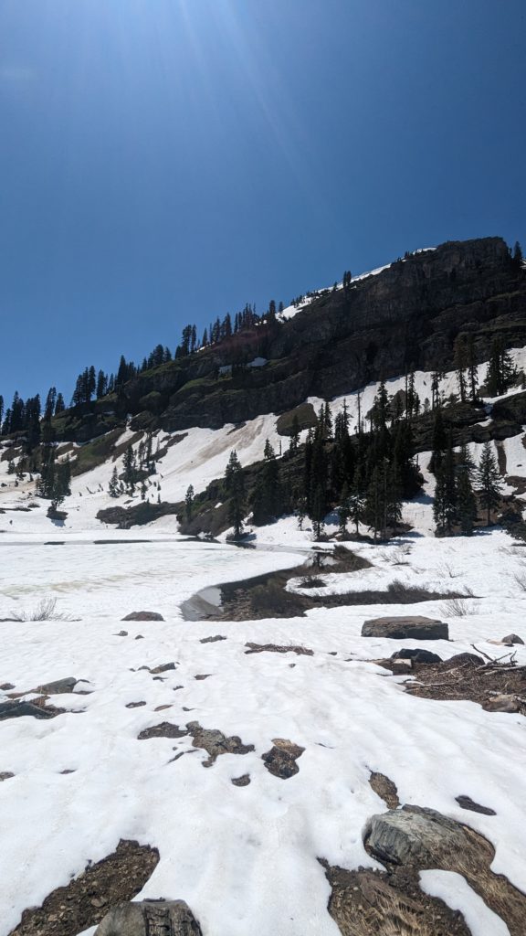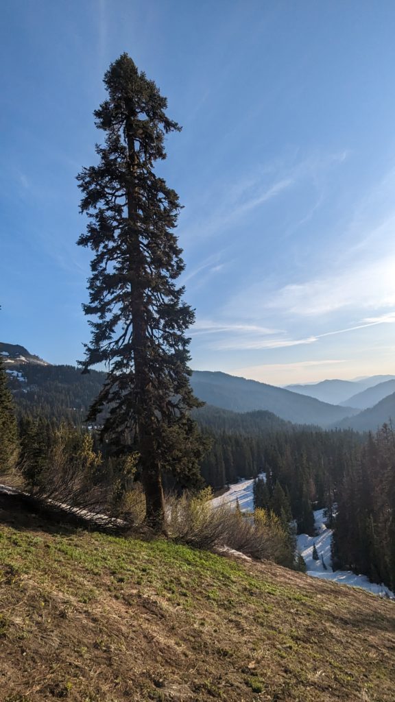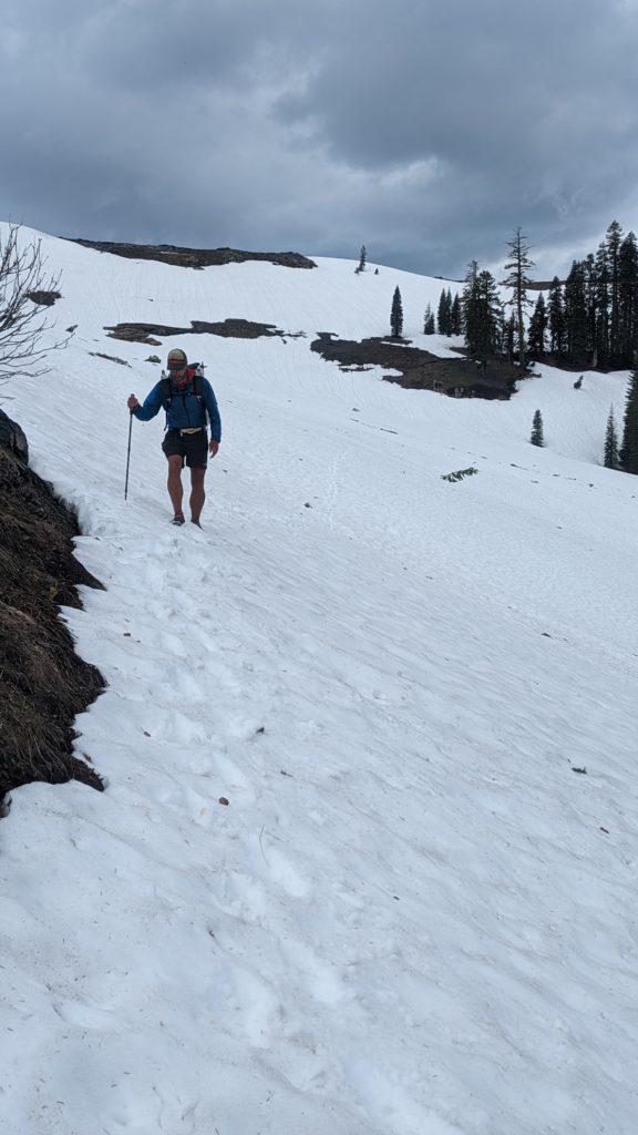 Das Stück in der Nähe vom „Man Eaten Lake“ Mitte des dritten Tags war allerdings so steil zu überqueren und die Bedingungen mit weichen Schnee so schlecht, dass wir uns entschieden aus Sicherheitsgründen das Stück weit zu umrunden und stattdessen den längeren Shackelford Greek Trail runter ins Tal zu nehmen und den Rest dann Straße nach Etna zu laufen.
