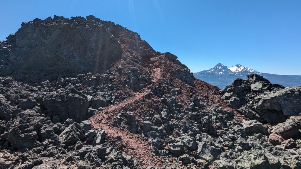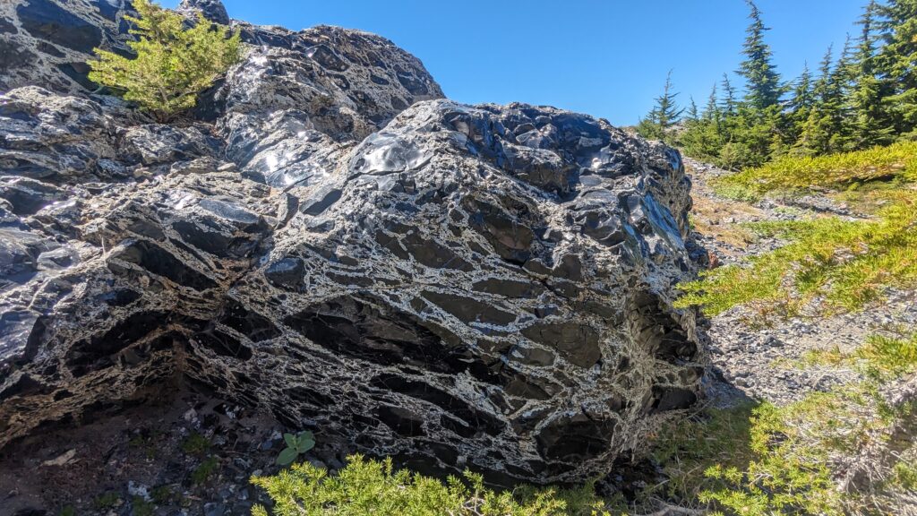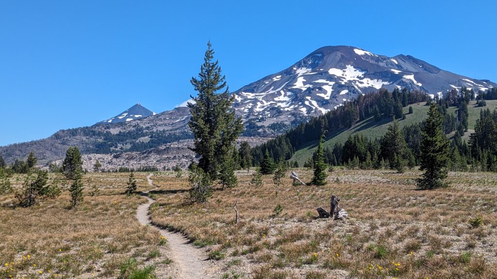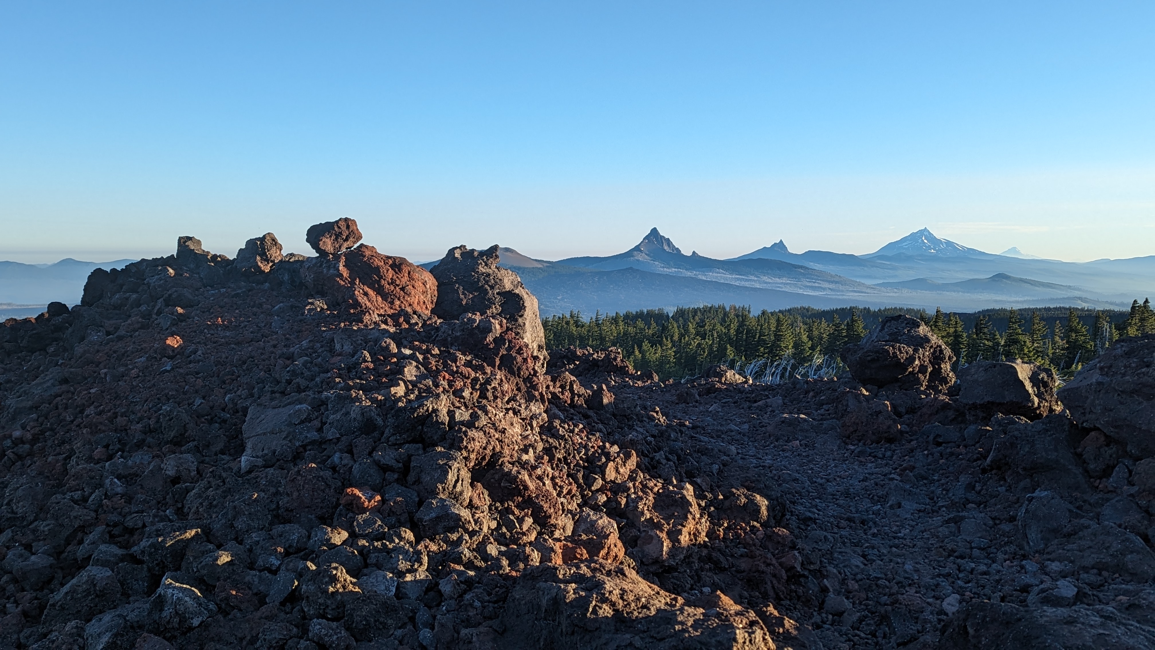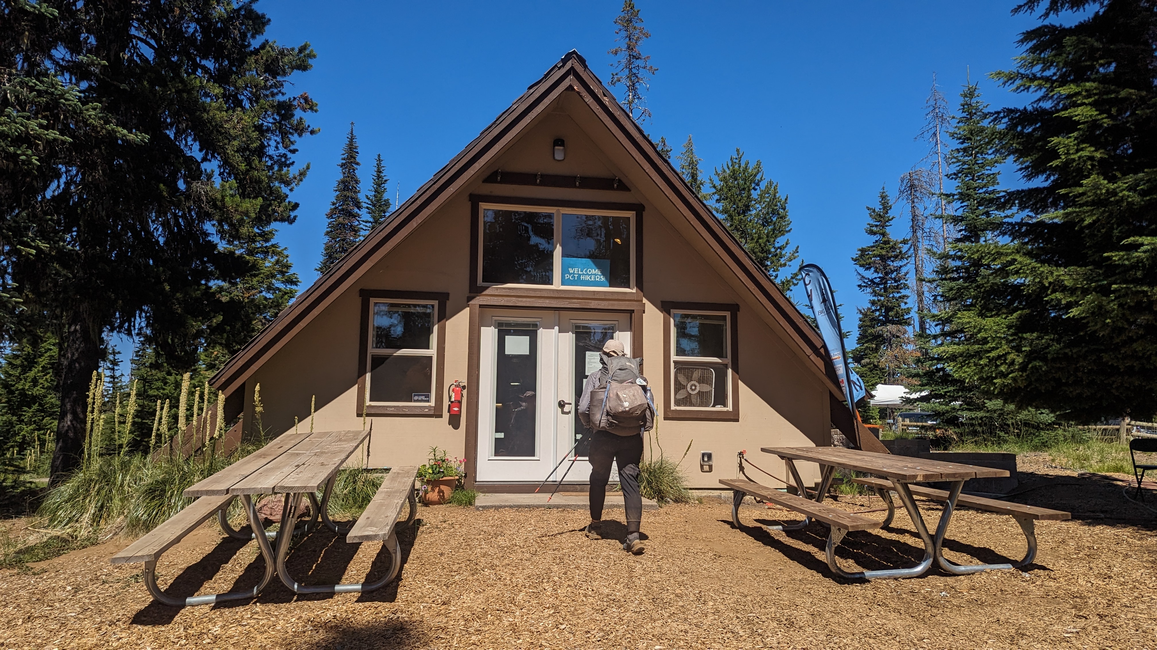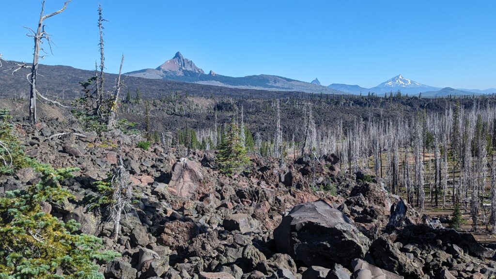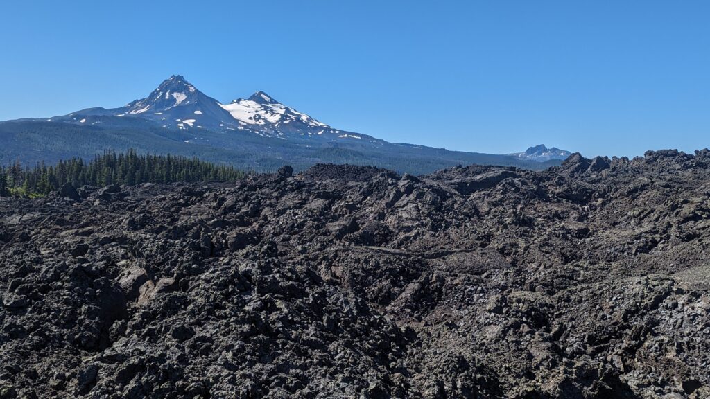 Die nächsten 2 Tage wechselte sich die Landschaft, es ging an den Sister-Bergen vorbei, durch eine Obsidian- und eine Vulkanlandschaft. Vor allem letzteres war sehr schön anzusehen, aber schwierig zu laufen. Zum Glück waren die Mücken dann aber weg. Übernachtet habe ich dann kurz vor dem Highway 20 im Big Lake Youth Camp, hier gab es ein separates Gebäude für PCT-Hiker, mit Küche, Laundry, Duschen und gefüllten Kühlschrank. Man durfte sogar kostenlos mit Abendessen und Frühstücken. Die eigentliche Übernachtung war aber im Zelt kurz neben dem Jugendcamp.