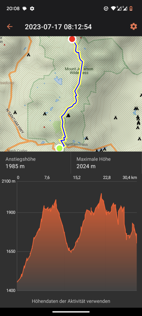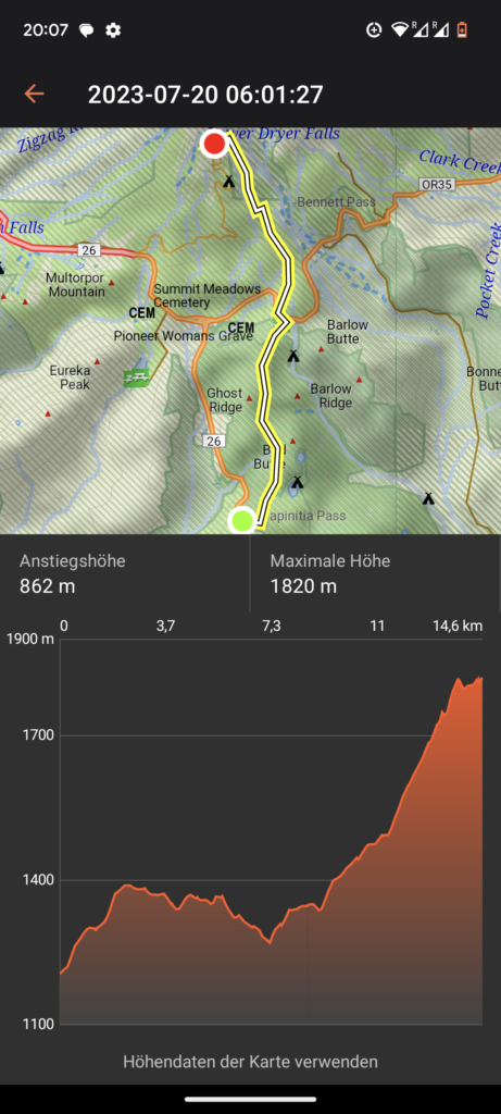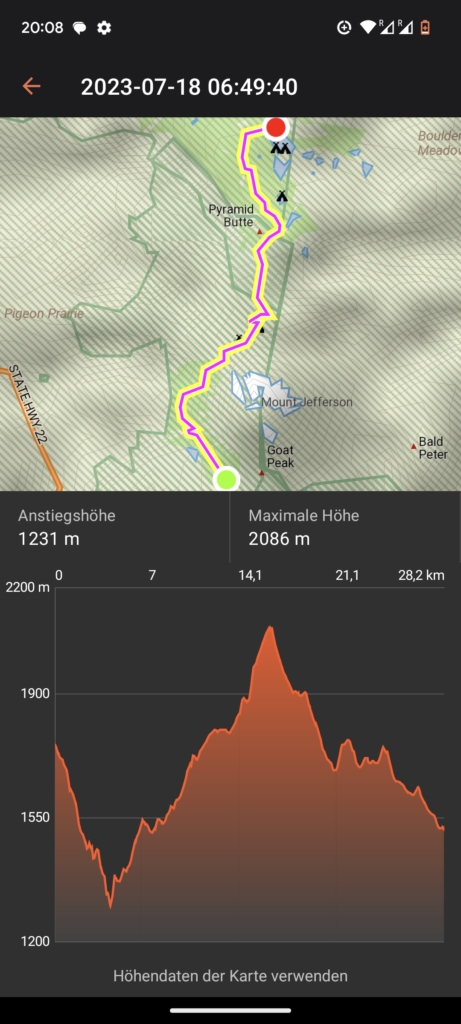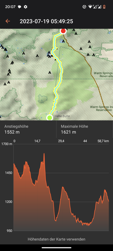 Vom Resort waren es dann noch ca. 51 Meilen bis zur Lodge und da ich zum Frühstück da sein wollte, entschied ich mich am dritten Tag 41 Meilen bis zum Anstieg am Mount Hood zu gehen, die ich erfolgreich bis 21:20 Uhr absolvierte. Persönlicher PCT-Record!