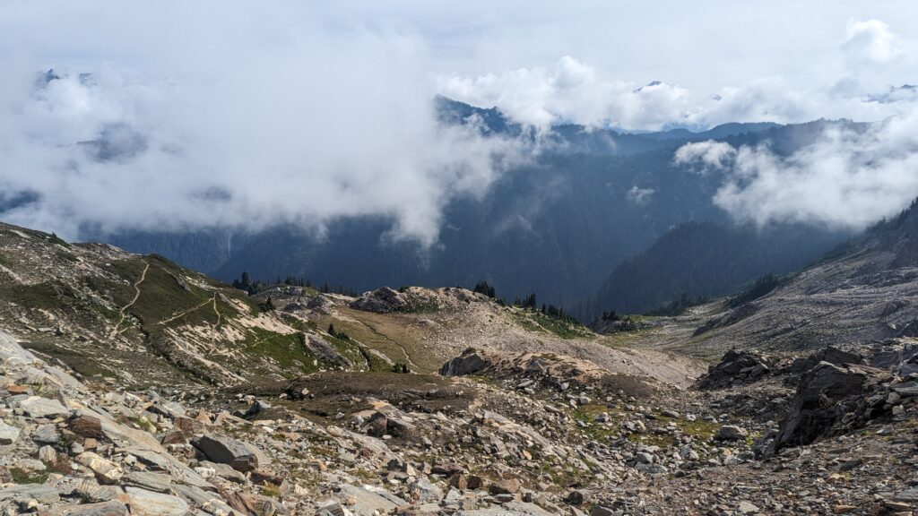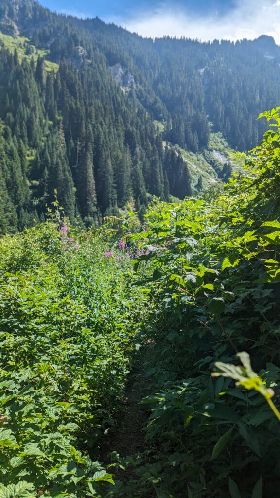 Es gibt einen Weg, den ich heute früh gegangen bin nach Manning Park, der Weg war auch ganz gut gewartet und nur 12 km. Die meisten Hiker gehen allerdings wieder 33 Meilen zurück zum Harts Pass und hitchen von dort aus über mehrere Stationen nach Seattle.